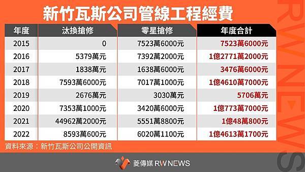 關於管線汰換計畫,邱世昌強調,竹瓦每年皆依據管線材質、耐用年限,或上一年度經檢測、維修漏氣頻率高,達汰換標準者,訂定年度汰換計畫並編列相關汰換預算,本年度已編列2億1630萬9360元整,除照原核定汰換計畫辦理外,本次事故受影響供氣範圍內有供氣安全之虞的大樓表外管,將優先列入汰換。
