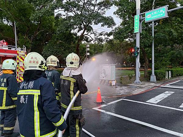 新竹縣政府消防局派員在場灑水、降溫,避免瓦斯逸漏後引發其他意外。(新竹縣政府消防局提供)
