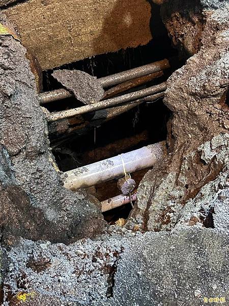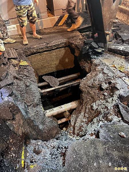果然今晚開挖現場就發現,緊鄰著小天坑「製造商」工地的排水溝確實有基礎被掏空現象,沒想到實際開挖赫然看見半個車道已經被掏空15公尺長,掏空深度至少有4、5公尺深。