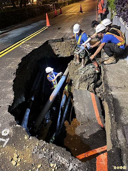 新竹縣政府工務處會同新竹瓦斯公司漏夜開挖瓦斯外洩現場後,工程人員冒險入坑切、塞瓦管,預計明天才能灌漿搶救。(記者黃美珠攝)