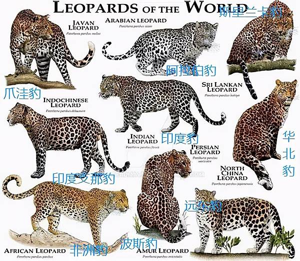 花豹包含上面提到9個亞種,分別是遠東豹,華北豹,印度支那豹,印度花豹,爪哇豹,斯里蘭卡豹,波斯豹,阿拉伯豹和非洲豹。
