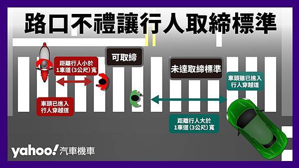 目前既有未停讓行人的取締基準,是以車頭距離斑馬線上行人不足一個車道寬(約3公尺)為準;其次是路口有義警、學校導護志工等交通指揮人員指揮時,駕駛若不聽從指揮強行通過者,可直接認定未停讓並舉發。