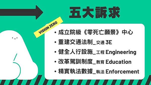 聯盟說,希望能在行人權益法制化,及交通3E(工程、教育、執法)等層面,全面提升所有用路人的安全。不只是因為「下了車,人人都是行人」,也因為「行人好,大家都會好!」行人地獄退散!「行人零死亡推動聯盟」8/27凱道遊行爭路權 - 生活 - 自由時報電子報 https://bit.ly/3CWVhIq