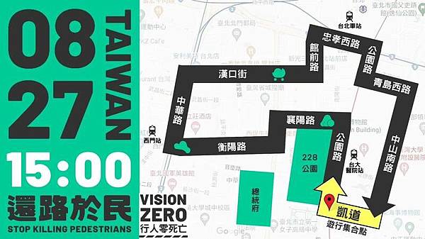 8月27日在台北凱達格蘭大道舉行的行人路權大遊行路線圖。(行人零死亡推動聯盟提供)