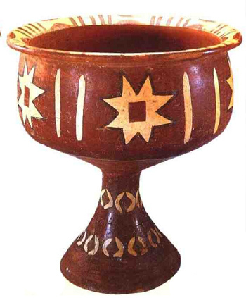 新石器時代,大汶口文化,1974年山東泰安大汶口遺址出土,現藏山東省文物考古研究所。高29.5厘米,口徑26厘米,足徑14.5厘米。泥質紅陶。侈口,折沿,深腹,喇叭形高圈足。通體磨光,器表施紅色陶衣,並用黑彩、白彩繪製八角紋、對弧線等。