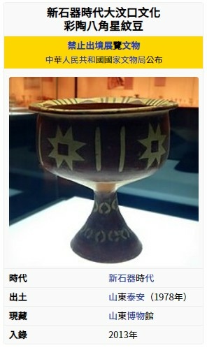 在山東博物館收藏著一件這一時期的器物,為第三批禁止出國(境)展覽文物,八角星紋彩陶豆。八角星紋彩陶豆,1978年出土於山東泰安大汶口遺址。口頸26厘米,足徑14.5厘米,通高28.4厘米;豆為盛食器,也是祭祀用的禮器。