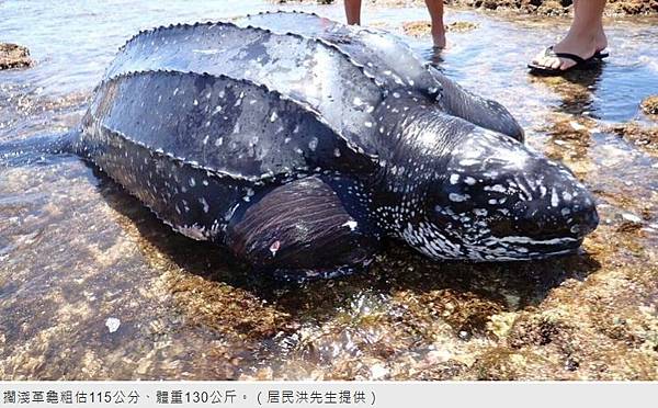 革龜是體型最大的海龜,這隻革龜4日下午在萬里桐潮間帶被發現時生命跡象相當微弱,粗估體長115公分、體重約130公斤,其他身體健康狀況還有待獸醫進一步檢測。