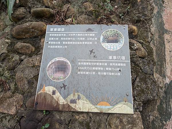 現場有設置導覽解說圖文,介紹當年國軍駐守此地軍事坑道, 使用美國製造MIAI式75公釐榴彈砲(簡稱75山砲), 射程長達9公里,每分鐘可發射16發。 竹北的新月沙灘及鳳山溪口都在射程之內。 1950年代,台海局勢緊張,台灣西部海岸,遍佈崗哨據點及防禦工事,對海峽嚴陣以待。 鳳崎落日步道沿途這些已廢棄的碉堡及軍事坑道,見證了這段歷史。