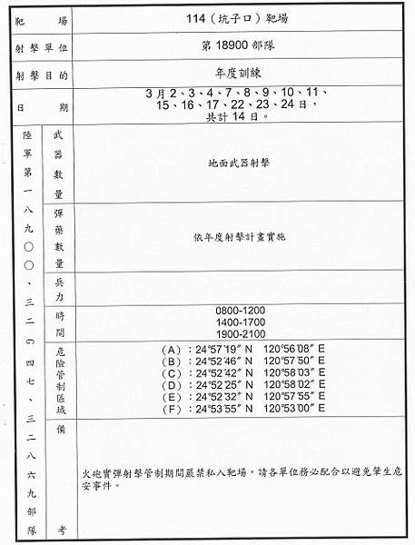 坑子口訓場部分,軍方將擴建第一射擊平台,屆時射擊課目除了瞬間停止射擊外,也增加行進間射擊;並將在戰車砲射擊目標區1600公尺處新建固定靶台及設置4座自動升降靶機;1800公尺射擊目標區則新建活動靶台及4座自動升降靶機;戰車射距將從1340公尺延伸至1800公尺。