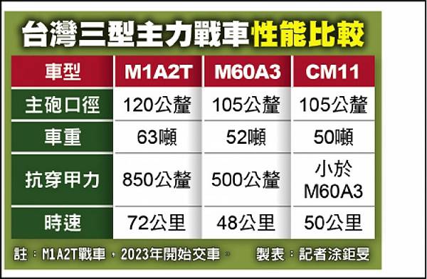 根據國防部官方網站M1A2T戰車採購說明,M1A2T的120公厘口徑滑膛砲,有效射程內可貫穿850公厘的均質鋼板;車身複合式裝甲,具抗穿甲力達850公厘,強化防護能力能抵禦敵軍主力戰車的射擊火力