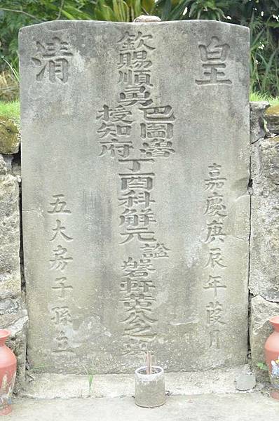 黃奠邦古墓墓碑上方左右刻「皇清」2字,中行字為「欽賜順勇巴圖魯授知府丁酋科解元謚磐軒黃公之墓」,右下為「嘉慶庚辰年葭月」,左下「五大房子孫立」。