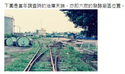 下圖是當年調查時的油庫末端,亦即六燃的發酵廠區位置。