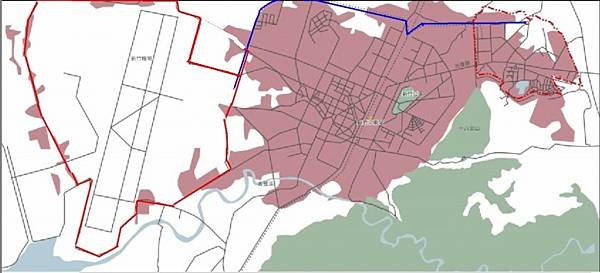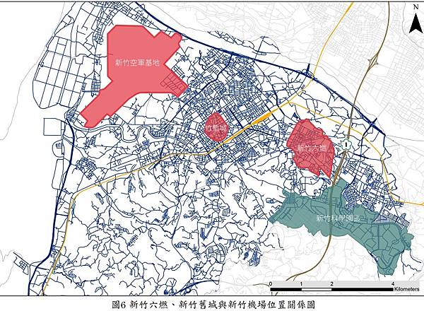 紅圈左為新竹飛行場,藍色線為軍用機場支線與台肥支線,紅圈右為六燃廠