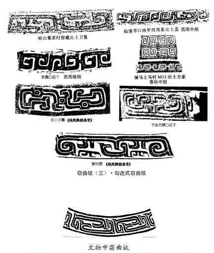 竊曲紋由鳥紋、龍紋衍化而來的痕跡是很明顯的。試將一部分鳥紋加以排比,可以推測出它向竊曲紋衍化的具體過程,較早的鳥紋在翅膀後邊接連着一條長長的尾巴,後來這個尾巴與軀體分離開來,成為一個彎卷的抽象紋飾,再後,鳥身部分也抽象化了,卻保留着原先的一根長長的羽毛,最後,這根羽毛也消失了,形成了典型的竊曲紋。