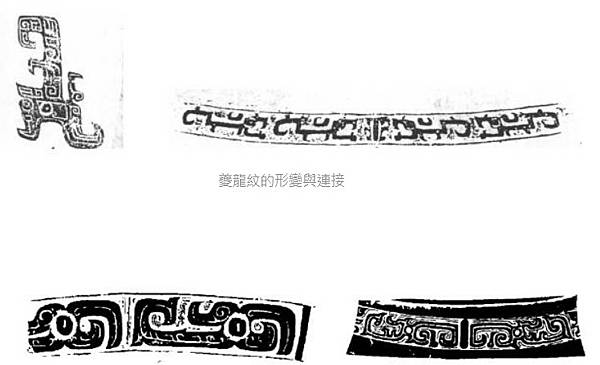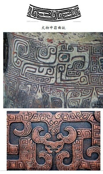 最初的龍紋是單一豎立的,雖然龍身體有不同的曲度,但是並非能表現其水流的靈動,後來把龍橫臥刻畫,用多個符飾連接,這些龍紋他們的線條流暢而靈動。我們可以在在象鼻龍紋的紋飾中可以看到橫G字紋和S字紋。總的來說,竊曲紋是有饕餮紋和龍紋的形變而來,並經過了再次的簡化。