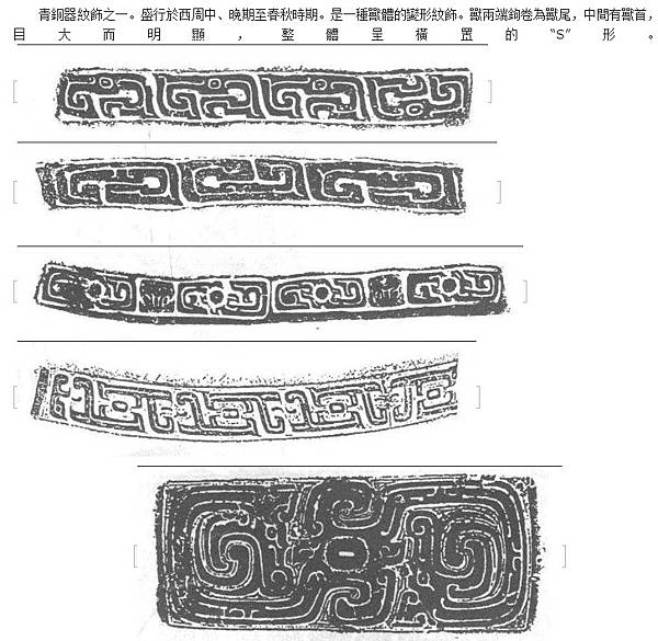 周代的一種重要裝飾紋樣。又稱竊曲紋、窮則曲。是一種適應裝飾部位要求而變形的動物紋樣,是動物的簡化和抽象化。周代打破了商代以來,以直線為主的裝飾特點,也打破了對稱格式。一般由兩端回鈎的或“S”形的線條構成扁長形圖案,中間常填以目形紋,但又未完全擺脱直線的雛形,因而形成直中有圓、圓中有方的特點。