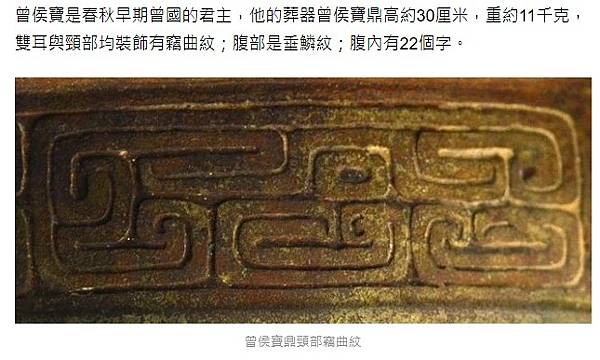 曾侯寶是春秋早期曾國的君主,他的葬器曾侯寶鼎高約30厘米,重約11千克,雙耳與頸部均裝飾有竊曲紋;腹部是垂鱗紋;腹內有22個字。