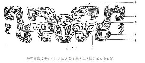 經典饕餮紋樣式 1.目 2.眉 3.角 4.鼻 5.耳 6軀 7.尾 8.腿 9.足