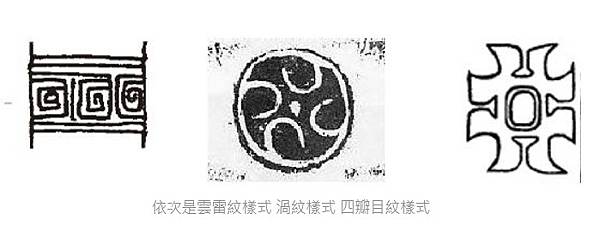 依次是雲雷紋樣式 渦紋樣式 四瓣目紋樣式