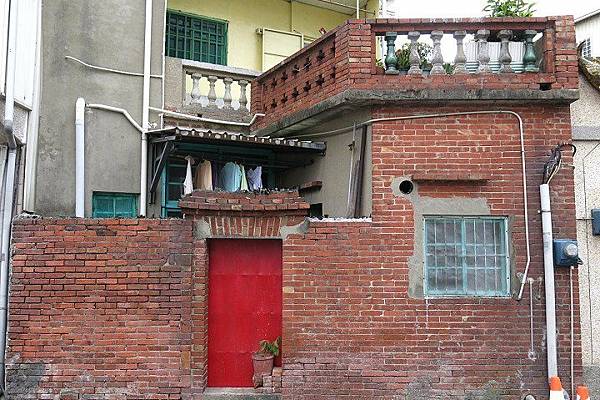 兩間現代式樓房中間所夾的紅磚老屋 XD