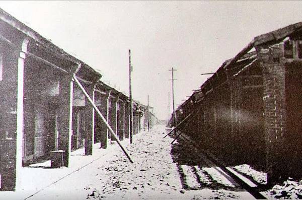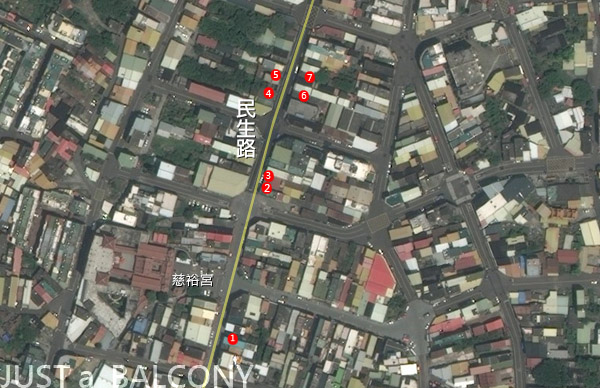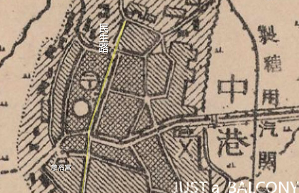 下圖可以看出早期民生路兩側皆為紅磚平房街屋