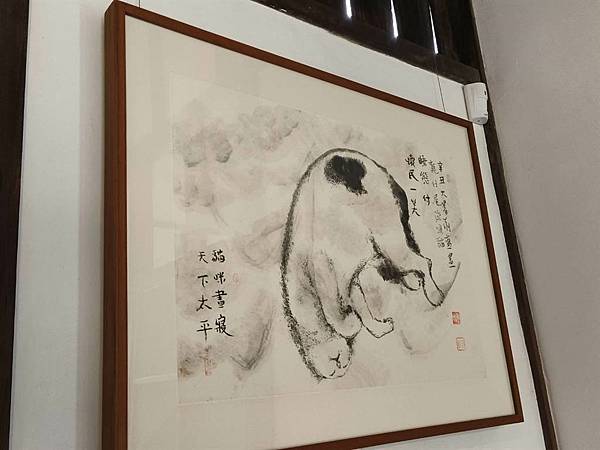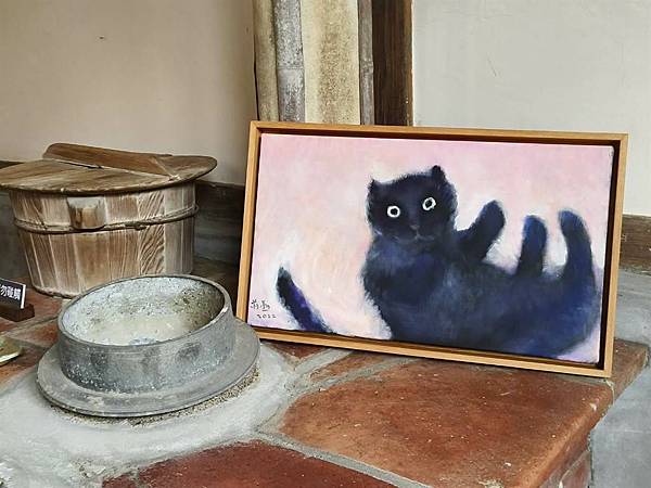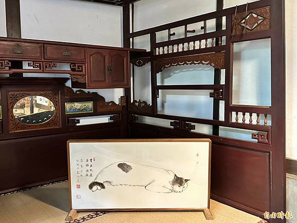 4幅水墨貓咪各有態度,有慵懶躺在榻榻米房書櫃上,有愛嬌地橫臥在古早紅眠床,還有1隻小黑貓四腳朝天躺在灶腳灶台上,胖胖黑斑白貓四腳八叉睡在食飯間牆上,蔣勳題字「貓咪晝寢,天下太平」,令人會心莞爾。