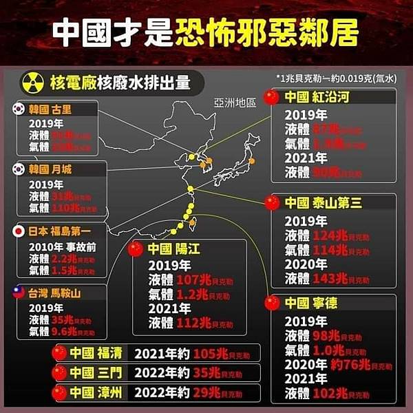 另據中國官方自行發布的核能年鑑資料,中國氚廢水排放量最大的四座核電廠氚廢水排放量,浙江秦山第三核電廠約143兆貝克、廣東陽江核電廠約122兆貝克、寧德核電廠約111兆貝克、紅沿河核電廠約107兆貝克。若對照福島計劃排放的氚含量,這四座核電廠每年排放的氚廢水,大約是福島計劃排放的5至7倍。