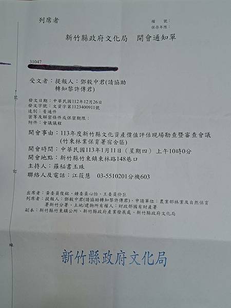 113年度 新竹縣文化資產價值評估現場勘查暨審查會議(竹東林業保育署宿舍區 登錄聚落建築群提報案)。113年1月11日,週四,上午10點。開會地點:竹東東林路148巷口。