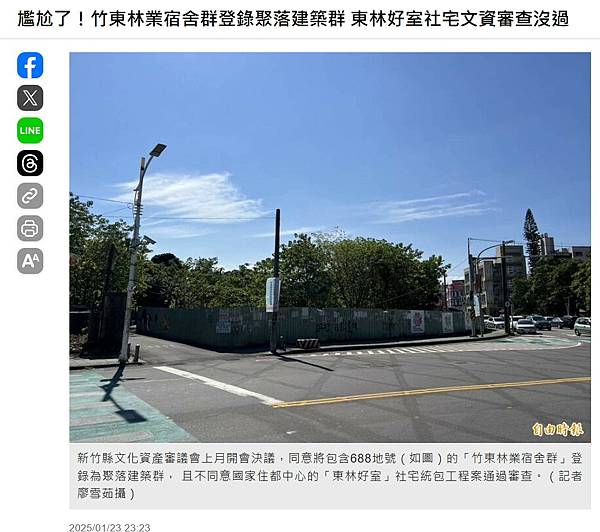 〔記者廖雪茹、洪美秀/新竹報導〕內政部委託國家住宅及都市更新中心規劃在新竹縣竹東鎮仁愛段六八八地號的「東林好室」社會住宅案,新建統包工程二○二三年已決標,並正式進入規劃設計及施工;不過,新竹縣文化資產審議會開會決議,同意將包含六八八地號的「竹東林業宿舍群」登錄為聚落建築群,且不同意「東林好室」社宅統包工程案通過審查。此決議讓竹東社宅案陷入尷尬處境。