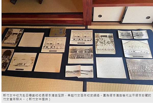 〔記者洪美秀/新竹報導〕新竹女中明年慶祝創校100年,校方除積極籌備明年12月1日的百年校慶系列活動,校長林桂鳳今年6月前往日本探尋竹女創校校長塚本清吉足跡,除與塚本高齡94歲的長媳宣江及69歲的長孫塚本洋一碰面,更看到許多塚本校長珍藏的竹女照片,且得知塚本的7名子女,幾乎都念竹女或竹中,竹女的創校校歌也是塚本邀鳥取縣日人所作,塚本長媳雖未見過塚本清吉,但看到竹女準備的精緻相本,適逢當日是日本父親節,感動流淚稱一切都是最美好的安排。