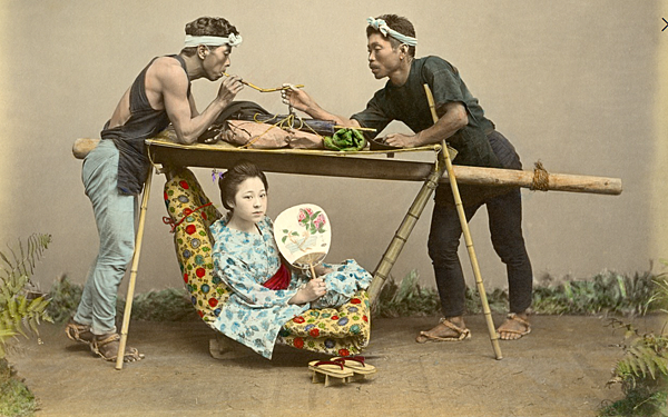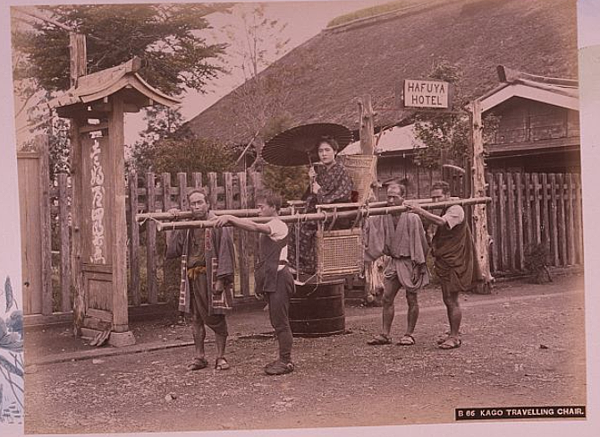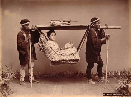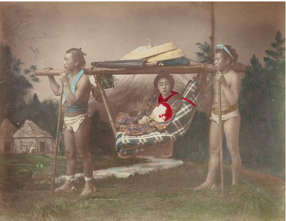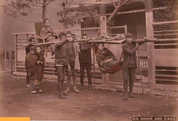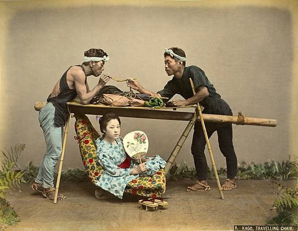 兩個只穿著纏腰布的男人拿著一根大桿子,桿子上懸掛著一個坐在椅子上的女人。Kago Travelling Chair - Kusakabe Kimbei — Google 藝術與文化 https://bit.ly/45JjYnV