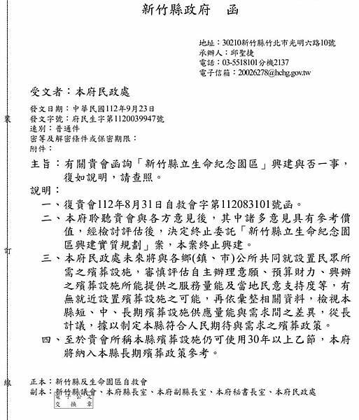 縣府民政處發文表示,縣府聆聽自救會與各方意見後,其中諸多意見具有參考價值,經檢討評估後,決定終止委託「新竹縣立生命紀念園區興建實質規劃」案,本案終止興建。