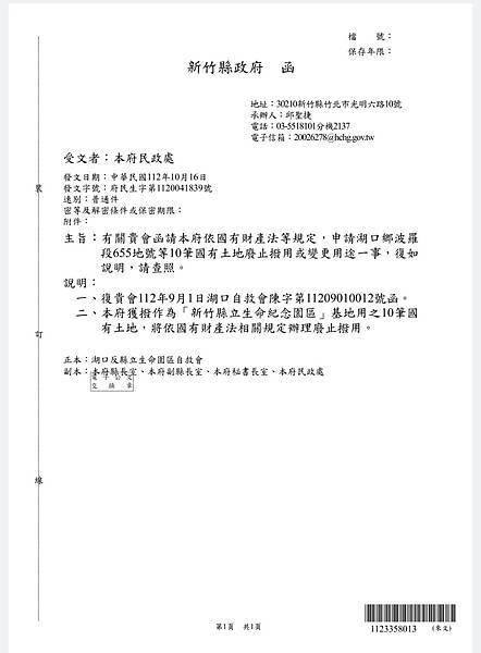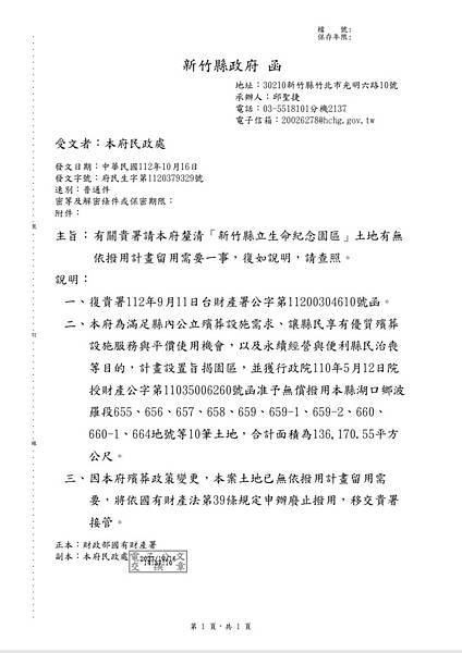 新竹縣政府10/16(今)回覆湖口反縣立生命園自救會有關函請新竹縣政府依國有財產法等規定,申請湖口鄉波羅段655地號等10筆國有土地廢止撥用或變更用途一事,復如說明: