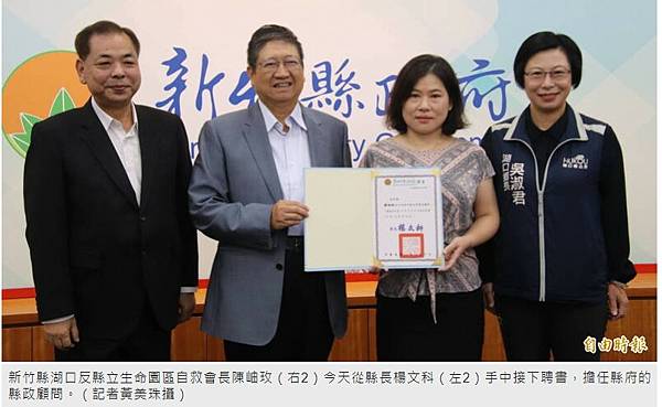 新竹縣湖口反縣立生命園區自救會長陳岫玫(右2)今天從縣長楊文科(左2)手中接下聘書,擔任縣府的縣政顧問。(記者黃美珠攝)