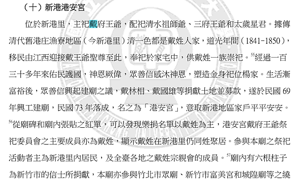 新港港安宮的戴府王爺(戴衢亨) 是臺灣戴姓宗親的信仰中心;