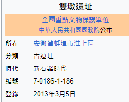 雙墩遺址位於蚌埠市小蚌埠鎮雙墩村境內,現存面積12000平方米。1986年、1991年、1992年先後三次發掘,發掘面積共375平方米,出土了大量文化遺物,是目前淮河中游地區已發現的年代最早的新石器時代文化遺存。(完)