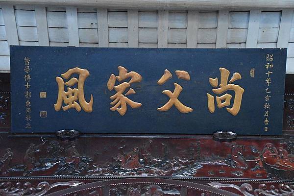 同年,石岡沙連墩郭屋祖祠重建完成,郭東周以醫學博士頭銜敬獻「尚父家風」匾額。尚父是皇帝對大臣的敬稱,唐德宗曾封郭姓始祖-郭子儀為汾陽郡王,尊他為「尚父」,所以匾詞的意思是說,郭子儀的風範為家族世代相傳。