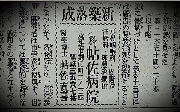 帖佐醫院屋齡近90年,位於現今建國四路、必忠街口,建於昭和8年(西元1933年),當年台灣總督府新竹、基隆、嘉義、高雄醫院醫官帖佐直喜,因健康因素請辭後,在高雄州堀江町一丁目六番地開設主治耳鼻咽喉、皮膚疾病醫院。