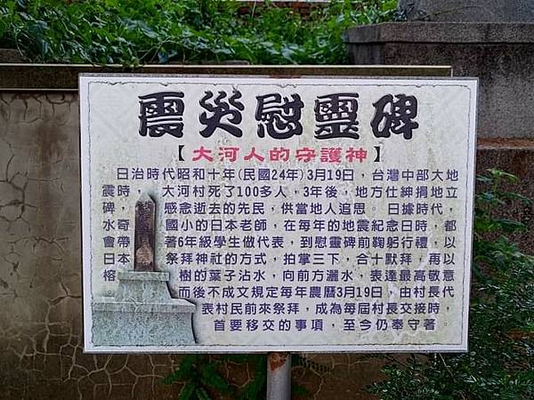 當天清晨的天搖地動中,有一百多人不幸罹難,為感念逝去的先民,經地方仕紳奔走號召,三年後,在當時的大河警察官吏派出所附近建立了「震災慰靈碑」。