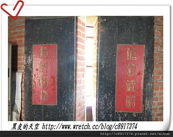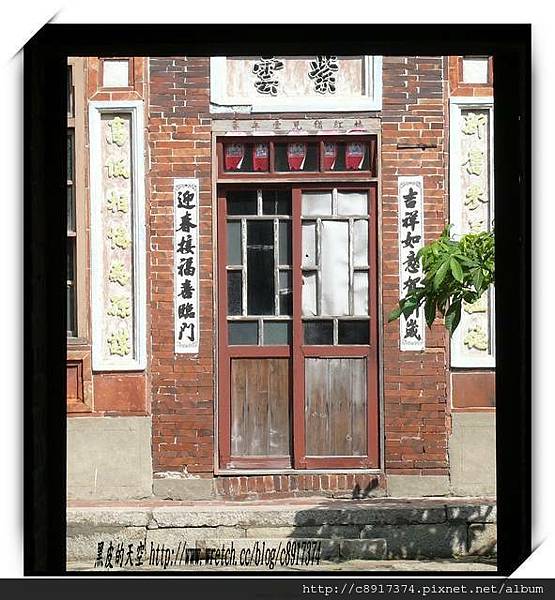 ↑大安中庄黃宅二進的窄小的拉門。們兩邊的門聯上,以交趾燒陶片黏貼「新舊參差應祖德」、「高低相協為孫謀」的對聯。好像是在對其突破傳統格局的困惑,做了最貼切的答覆。