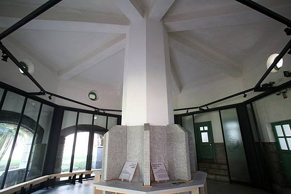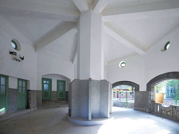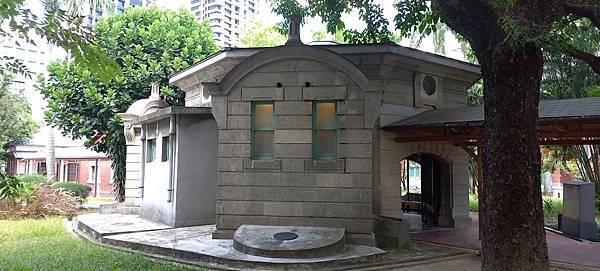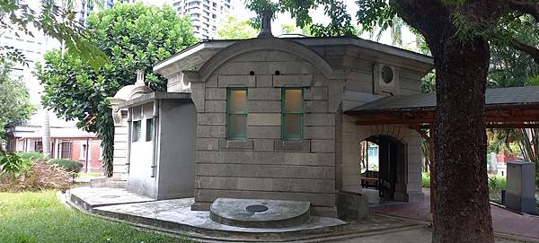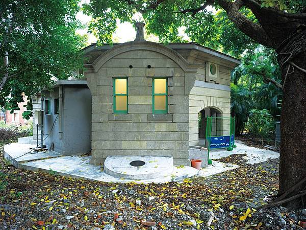 一棟鋼筋混凝土混和磚造古典建築,優雅矗立在園區庭院正中央,宛如八角涼亭的設計,從中央向外放射出去,內部潔白高雅,配上復古的綠色門窗,不說還以為是哪個休憩造景,沒想到百年前竟然是新潮的男子公廁!上至高官,下至基層員工,每天一定都得來這裡報到。
