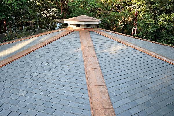 八角樓以中央的八角柱為主結構,柱體中空,上面通風透氣,下面集中注流;在內部往上一瞧,從柱頂伸出8支放射狀的梁,宛如一把撐開的傘。屋頂的石板瓦,更是從天然岩石上片下來的石板瓦,非人工燒製而成。