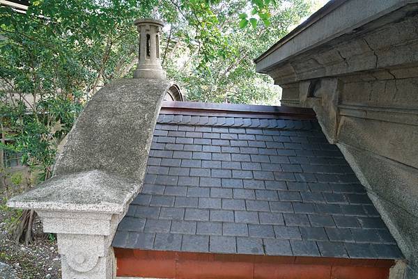 在設計上屋頂為石砌石板瓦,上方有似煙囪造形通風口與牛腿裝飾造型,外牆為洗石子原色,內部中柱使用馬賽克拼貼,頂上伸出八支放射狀的梁,結構宛如一把撐開的雨傘。出入口為拱門造型,加上牆面分割線形成古典石砌的建築風格。