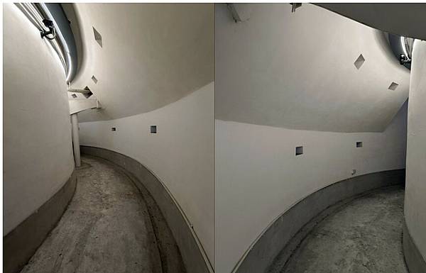 位置正在圓山大飯店的西側密道,可以看到隧道裡面都是蜿蜒的,這就是為了以防被子彈射擊,另外可以在牆壁上看到這些尖尖的消音錐以及防爆燈,這些都是為了增加逃生的安全性。