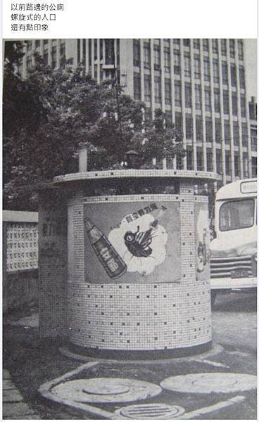 民國七十幾年-像太極一樣,一邊是男的,一邊是女的, 入口不同。 都是蹲的,可沖水。以前民權西路重慶北路口有一座、旁邊是學校在大橋國小面對民權國中這邊-蝸牛形公廁,被稱呼為子秋式廁所-許子秋擔任衛生署長的時候,在全國各地所建的蝸牛形公廁,被稱呼為子秋式廁所。只剩南港路二段(土地公廟旁)(地磅)碩果僅存 https://www.architw.org.tw/ftp/magazine/mag68/68th22.pdf