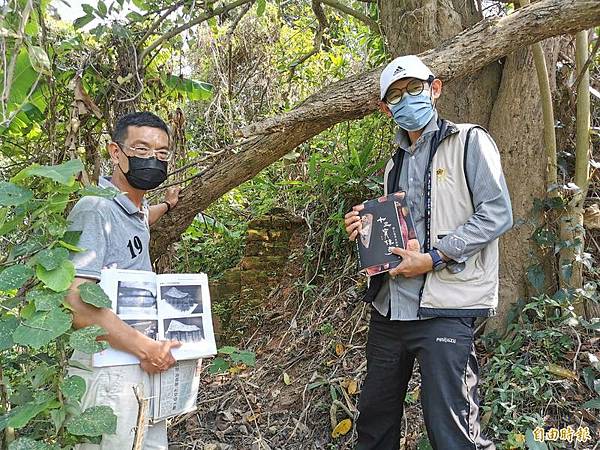 紅瓦厝國小老師許耿肇(左)與文史工作者張清泓踏查確認「保東窯」現況。(記者吳俊鋒攝)