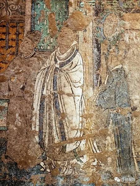 那麼隋唐時期的「方心曲領」該是什麼樣子呢?透過比較一些反映當時符合文獻記載的人物裝束畫像,「方心曲領」非常可能是一個有點像往外豁的圓領。