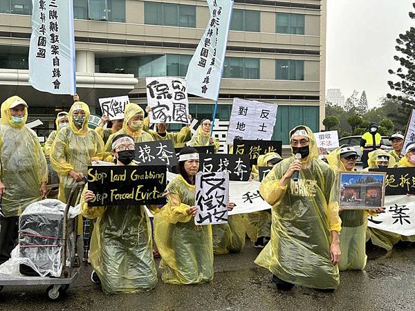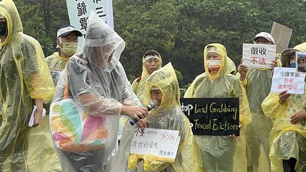 自救會約50人今天上午9點就在科管局前集合,全員穿上雨衣高喊口號「反徵收、反迫遷、反掠奪」,並高舉旗幟、白布條,要求科管局官員出面說明。自救會成員哭訴,7月才獲知自己的土地即將被徵收,讓他們吃睡不安,不僅大人焦慮,連年幼的孩子都惶恐不安。