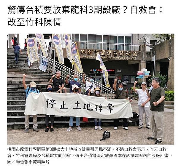 桃園市龍潭科學園區第3期擴大土地徵收計畫引居民不滿,不過自救會表示,昨天自救會、竹科管理局及台積電共同開會,傳出台積電決定放棄原本在該擴建案內的設廠計畫。 驚傳台積要放棄龍科3期設廠?自救會:改至竹科陳情 | 產業熱點 | 產業 | 經濟日報 https://bit.ly/3ZSbp8J