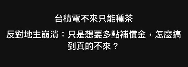 臉書地方社團「我是中壢人」近日發文表示,抗議的地主本來以為,台積電很有錢可以多給點補償金,沒想到抗議之後竟然就直接不來,現在這塊土地只能拿來種茶。